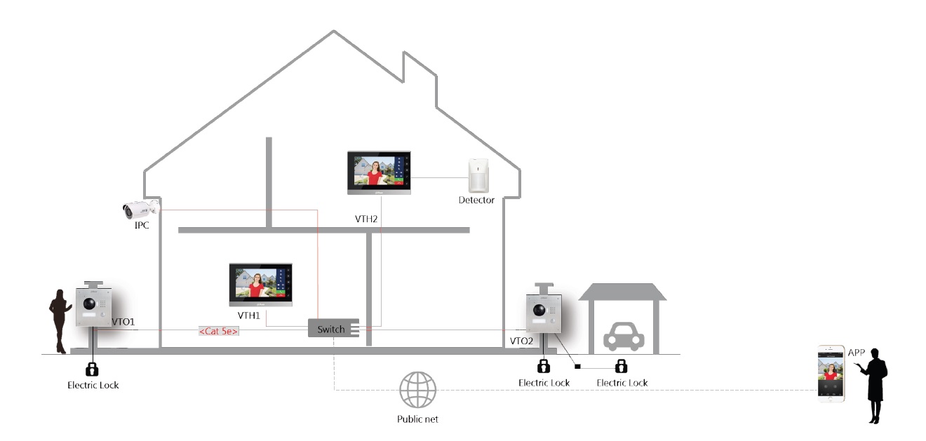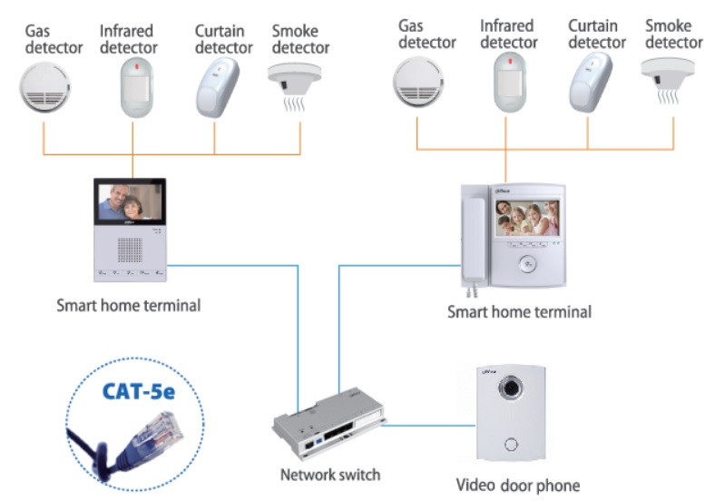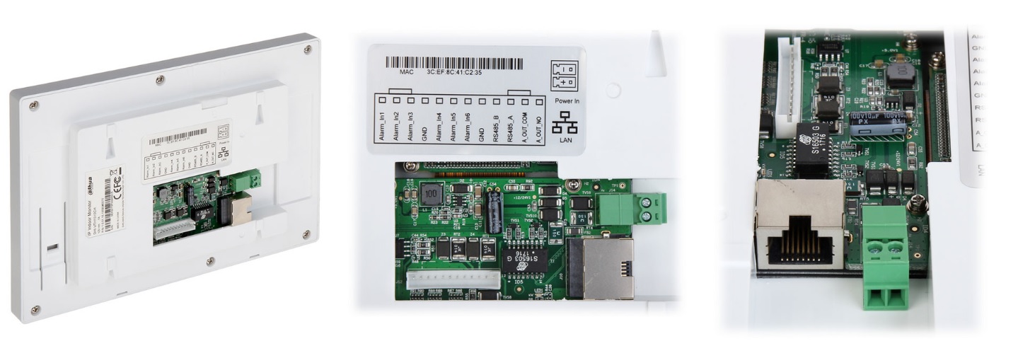 Для соединений в устройстве имеются входы LAN, RS485,  6 тревожных выходов дают возможность подключить датчики тревоги или другие бытовые сенсоры. При необходимости можно совершать звонки с монитора на монитор или на ПК службы, которые снабжены телефонной книжкой. Осуществляется возможность управления 2 замками (управление дверьми), подключения до 8 IP панелей вызова и до 32 IP камер видеонаблюдения.
