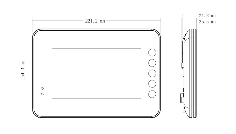 Емкостный сенсорный дисплей 7". Разрешение 800x480 пикселей. 8 тревожных входов. Максимальная потребляемая мощность 7Вт, Ethernet 100Мбит/с. Возможность подключения до 20 IP-вызывных панелей и просмотр до 8 IP-камер.