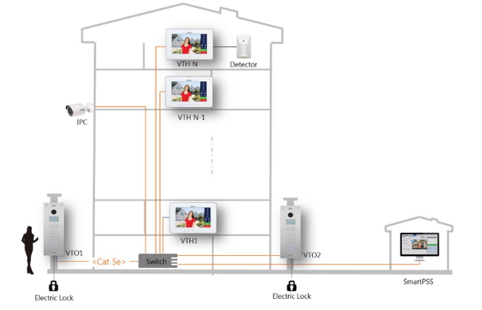 Цифровой домофон Dahua DHI-VTH5221DW может использоваться в качестве главного элемента системы контроля доступа в частные дома и коммерческие здания. Кроме того, мониторы этой модели поддерживают подключение IP-камер для контроля за окружающей обстановкой. Поэтому они могут играть роль главных модулей небольшой, но надежной системы безопасности.