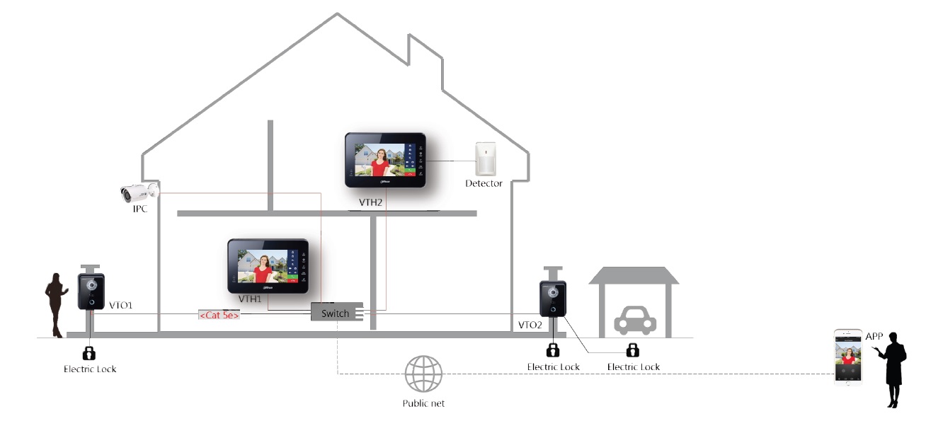 Объектив 3.6мм, угол обзора по диагонали: 120°; по горизонтали: 90°. Предназначена для обзора пространства перед входной дверью и двусторонней связи с посетителем. Работает совместно с IP-монитором или сервером VTMS. Переадресация вызовов на смартфон или планшет iPhone/Android.