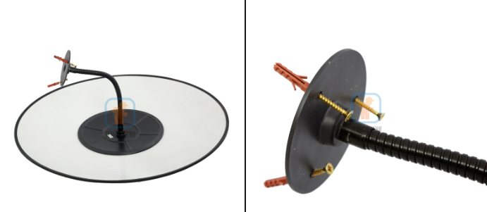 1. Планшайба со вставленной в нее гайкой крепится саморезами к стене в месте размещения зеркала;