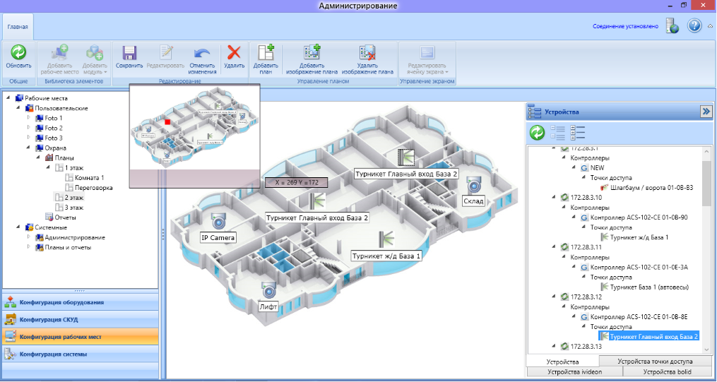 - Размещение на планах как элементов СКУД, так и видео камер и интегрированных устройств ОПС Болид;