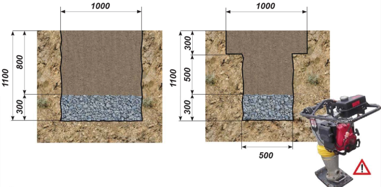 Размеры углубления в поверхности с учетом дренажа (для водоотвода) представлены ниже: