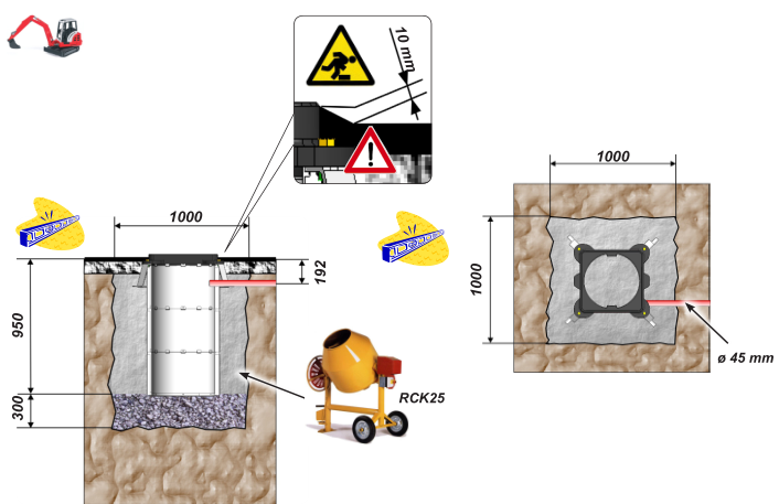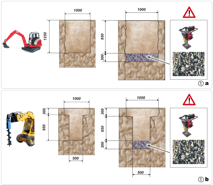 Размеры углубления в поверхности с учетом дренажа (для водоотвода) представлены ниже: