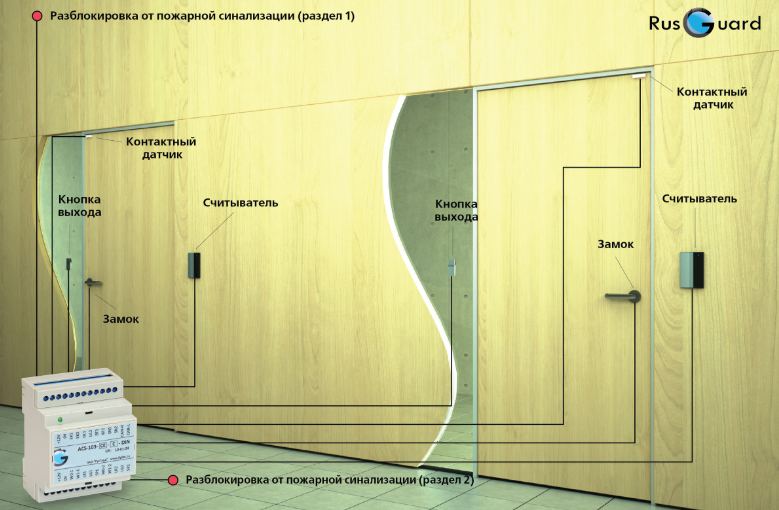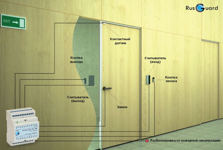 • Две двери (считыватель на вход, кнопка на выход) + пожарная сигнализация