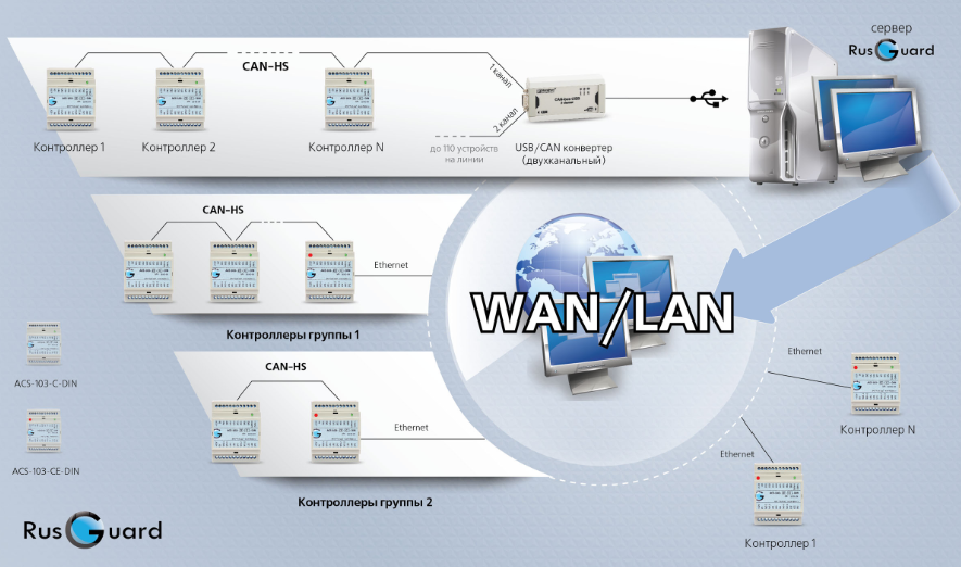 • Через Ethernet-порт любого контроллера СКУД серии -CE- от RusGuard;