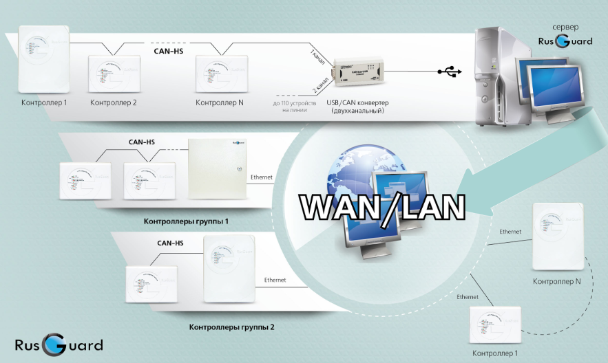 • Через Ethernet-порт любого контроллера СКУД серии -CE- от RusGuard;