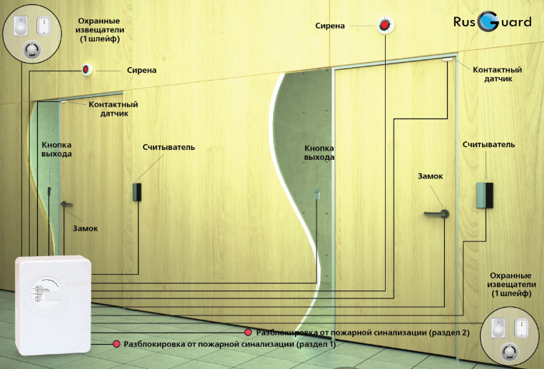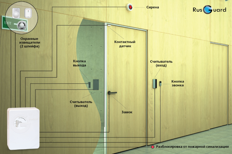 • Дверь (считыватель на вход и выход)+пожарная сигнализация