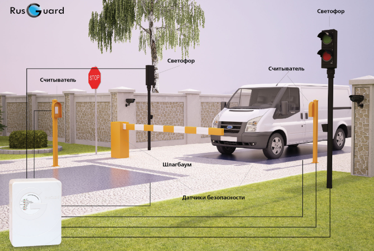 • Шлагбаум (считыватели на въезд и выезд) + светофор