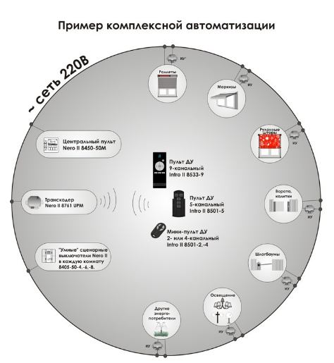 Комплексную автоматизацию в Вашем доме (управление Роллетами, маркизами, воротами, калитками, освещением и другими энергопотребителями) можно осуществить если совместить радиосистему Intro II и интеллектуальную систему Nero II: