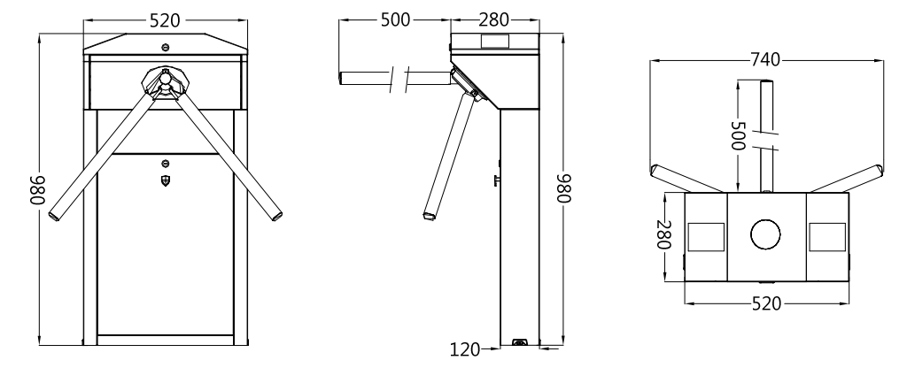 Габаритные размеры турникета без планок (Д*Ш*В)