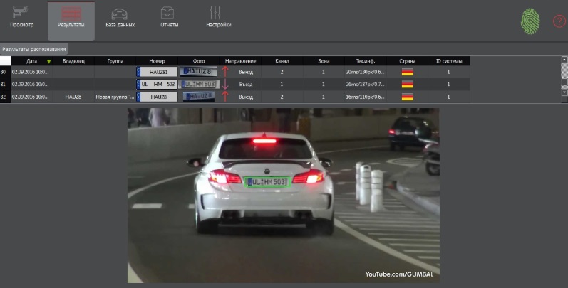 - Распознанные номерные знаки сохраняются в базу данных, которую можно экспортировать в csv-формат (Microsoft Excel). Также предусмотрен импорт базы данных. База данных содержит записи распознанных номерных знаков, а также: изображение автомобиля, время фиксации проезда, номер канала, зоны распознавания и комментарии. Дополнительно возможно создавать группы номеров и задавать им соответствующие реакции.