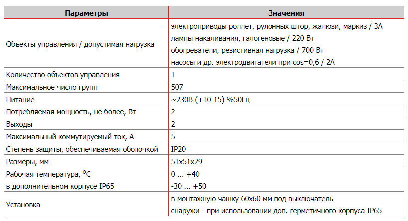 электроприводы роллет, рулонных штор, шлагбаумы; жалюзи, маркиз / 3А лампы накаливания, галогеновые / 220 Вт обогреватели, резистивная нагрузка / 700 Вт насосы и др. электродвигатели при cos=0,6 / 2А