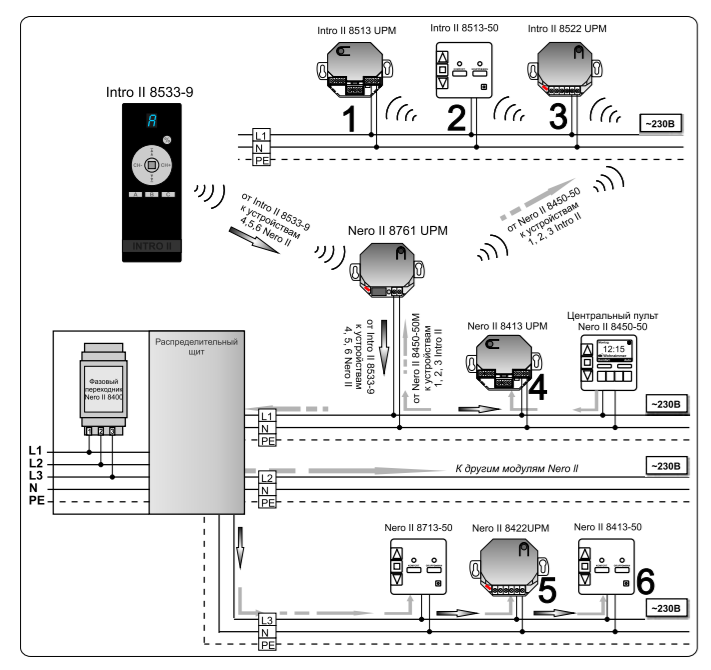 - трансляция» сетевых команд Nero II в радиокоманды Intro II и наоборот;