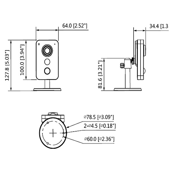 Не смотря на то, что IP камера Dahua DH-IPC-K35AP предназначена для внутренней установки, она приятно удивит способностью работать даже при отрицательной температуре окружающей среды. В целом рабочий диапазон температуры для нее находится в диапазоне от -10°C до +45°C. Видеокамера не классифицируется по индексу защиты от попадания воды, потому стоит выполнять монтаж видеокамеры в безопасные места без вероятности случайного попадания воды на корпус. Компактная камера DH-IPC-K35AP обладает максимальным энергопотреблением не более 4,85 Вт (400 мА), а для питания необходимо использовать любой блок питания DC 12В или блок бесперебойного питания рассчитанные на соответствующую нагрузку. Допускается полноценная работа устройства при напряжении от 10,8 В до 13,2 В. Кроме того, не стоит забывать о возможности подключения и подачи питания по одному кабелю витой пары с помощью технологии PoE. Габаритные размеры этой профессиональной IP камеры — Ø78,5x127,8 мм.
