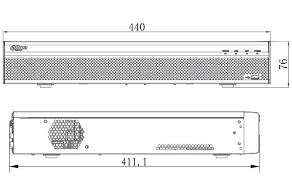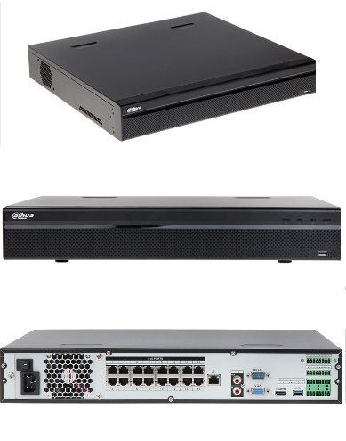 Видеорегистратор оснащен HDMI, VGA видеовыходами, поддержка разрешения 4K позволяет подключать к регистратору монитор с рабочим разрешением до 3840 × 2160 пикселей. Оснащен 2-мя USB-портами для периферийных устройств, 1-м портом Ethernet 1000Гбит/с, встроенным коммутатором на 16 портов с поддержкой PoE (IEEE802.3af/at), осуществляет поддержку функций интеллектуальной системой видеоаналитики (IVS) камер (обнаружения движения, MD зоны: 396 (22×18), потери видео, взлома).